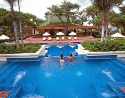 Die Hotelanlage hat uns sehr gut gefallen. Sie ist sauber, gepflegt und wirklich schön gestaltet. In einem etwa 5 ha großen, üppig bepflanzten tropischen Garten befindet sich ein außergewöhnlicher Pool. Er schlängelt sich wie ein Fluss durch die Anlage und es gibt einen Jacuzzi, eine lange Wasserrutsche, Wasserstraße und Wasserfall. Das Kinderbecken ist besonders schön, da ein kleiner Sandstrand direkt davor gelagert ist. Aber auch die Erwachsenen trennt nur eine kleine Treppe vom Meer. Die Poolbar befindet sich in Mitten der Poollandschaft und bietet den ganzen Tag über Snacks und Getränke an. Alle Gebäude sind thailändisch inspiriert und passen hervorragend zur übrigen Hotelanlage.